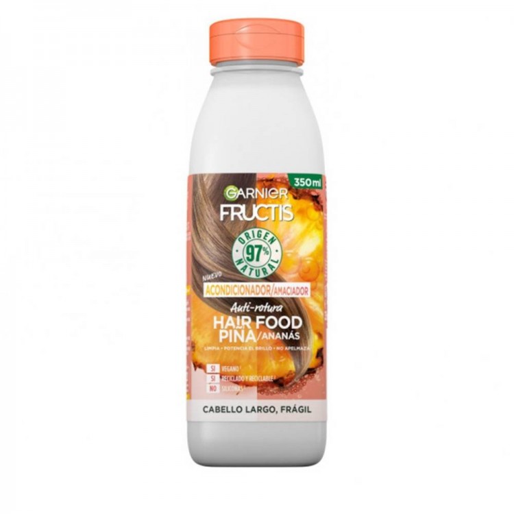 Amaciador Garnier Fructis Hair Food Ananás com uma fórmula vegan e 97% de ingredientes de origem natural. Testado dermatologicamente. Sem silicones. Nutre e limpa o cabelo evitando a sua quebra.