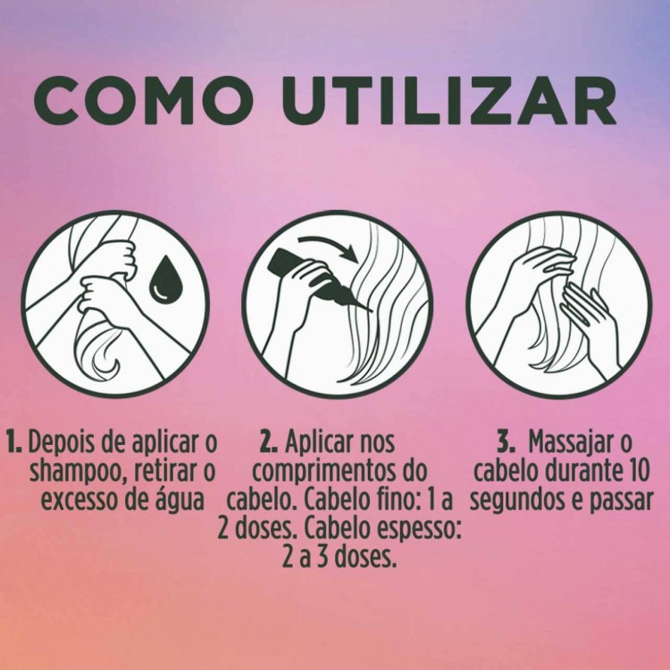 2. Aplicar nos comprimentos do cabelo. Cabelo fino: 1 a 2 doses. Cabelo espesso: 2 a 3 doses.