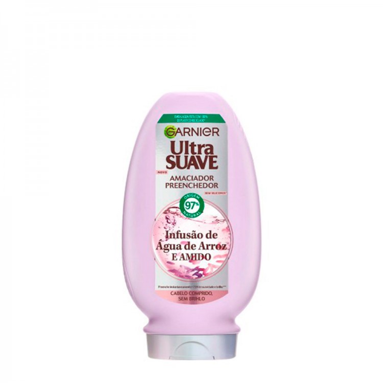 Garnier Ultra Suave Infusão de Água de Arroz Condicionador 200ml: Este condicionador nutritivo, com fórmula vegana e enriquecida com Ácido Hialurónico e Manteiga de Karité, desembaraça e amacia os fios.