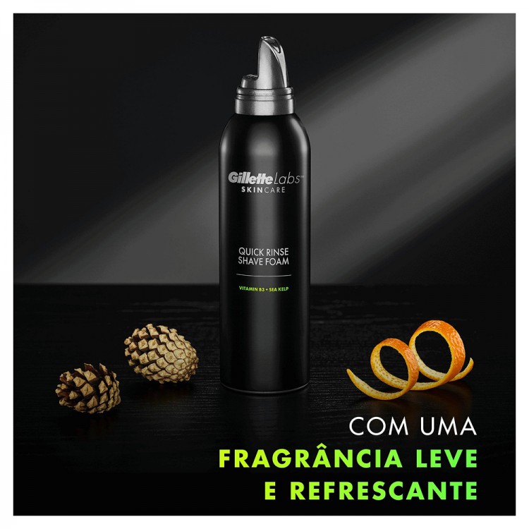 A espuma de barbear fácil de enxaguar Gillette Labs é uma fórmula leve que se enxagua facilmente. Esta espuma de barbear para homem não contém álcool nem corantes e ajuda a proteger a pele durante o barbear. Para usar, basta aplicar, barbear e enxaguar. Para um barbear rápido, fácil e refrescante ou para ter uma sensação de toalha quente, usa esta espuma de barbear com as máquinas de barbear GilletteLabs. Inclui a GilletteLabs com barra exfoliante e GilletteLabs Heated Razor. A gama de produtos GilletteLabs é um excelente presente para homem. Esta espuma de barbear tem uma fragrância leve e refrescante, e a embalagem é feita numa lata de alumínio totalmente reciclável.