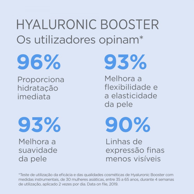 Benefícios Com uma avançada combinação de duas moléculas de ácido hialurónico, de médio e baixo peso molecular, que ajudam a pele a recuperar os seus níveis de hidratação para conseguir uma pele radiante.