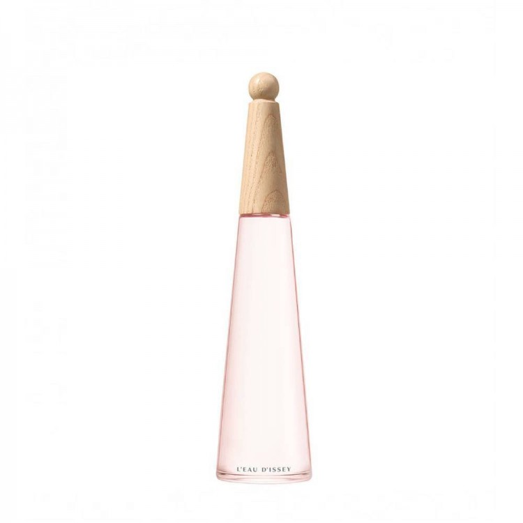 O frasco de L'Eau d'Issey Pivoine é feito com 20% de vidro reciclado e possui uma tampa sem plástico e feita de madeira proveniente de florestas geridas de forma sustentável.