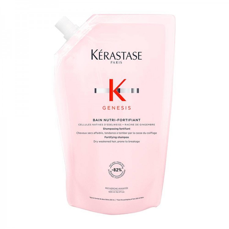 Kérastase Genesis Bain Nutri-Fortifiant Refill 500ml: Esta fórmula rica forma uma espuma untuosa, removendo a sujidade e o excesso de óleo, proporcionando nutrição intensa para cabelos secos.