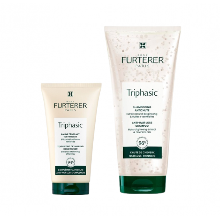 Kit Queda composto por Rene Furterer Triphasic Shampoo Estimulante 100ml e René Furterer Triphasic Bálsamo Desembaraçador 30ml.