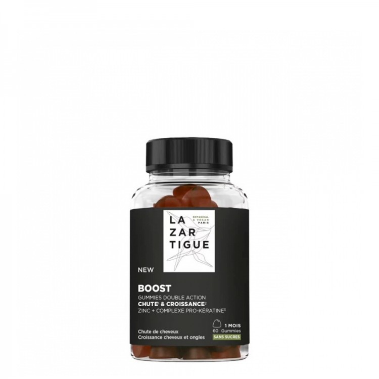 Lazartigue Boost Suplemento Alimentar 30 gomas: O suplemento alimentar Boost ajuda a combater eficazmente a queda de cabelo progressiva ou reacional, graças à sua dupla ação inovadora que abranda a queda do cabelo ao mesmo tempo que estimula o seu crescim