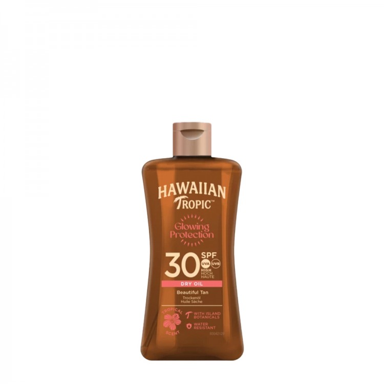 Hawaiian Tropic Protective Óleo Seco Bronzeador SPF30 100ml: Bronzeador com SPF30, com textura de óleo seco. A sua fórmula, enriquecida com vitaminas C e E (antioxidantes), coco e goiaba, oferece proteção para um bronzeado mais saudável com um tom dourado