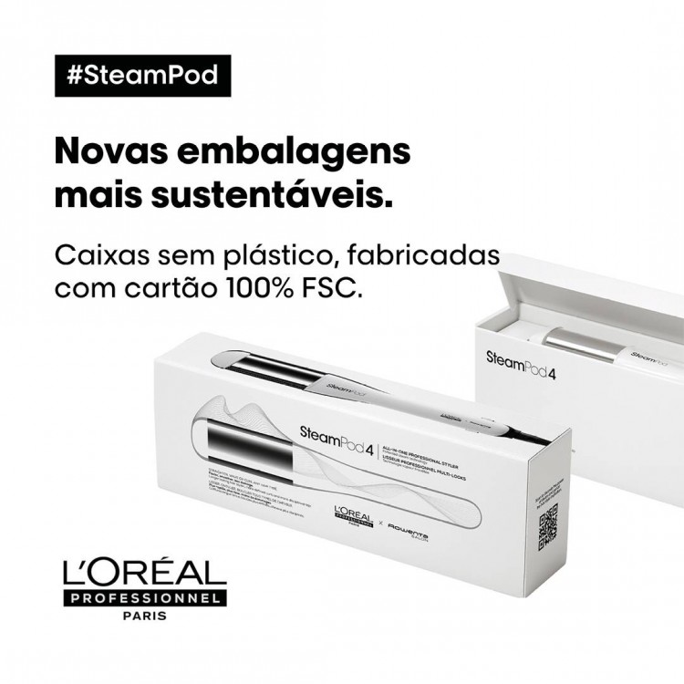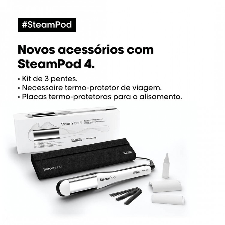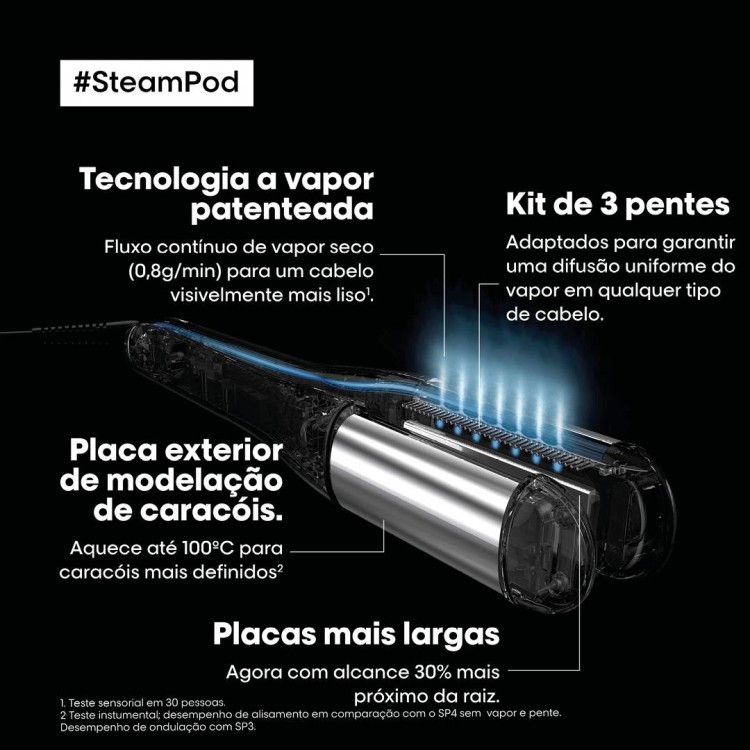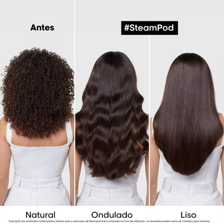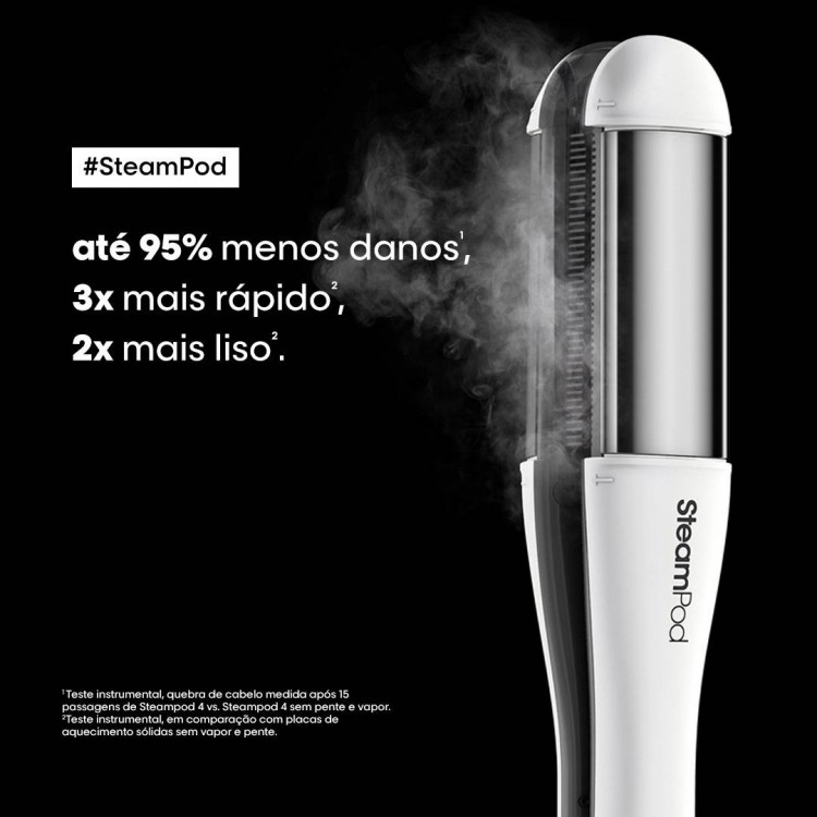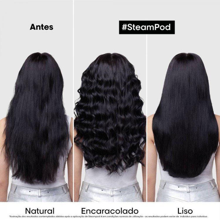 Descrição SteamPod 4, a primeira placa profissional All-in-One com tecnologia a vapor de L'Oréal Professionnel, para lisos e ondulados sem complicações. Consiga resultados profissionais em qualquer tipo de cabelo com até 95% menos danos no cabelo¹, 3x mais rápido² e 2x mais liso². Looks duradouros³, caracóis mais definidos? e lisos com maior suavidade?.