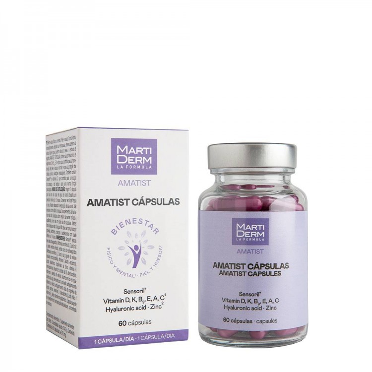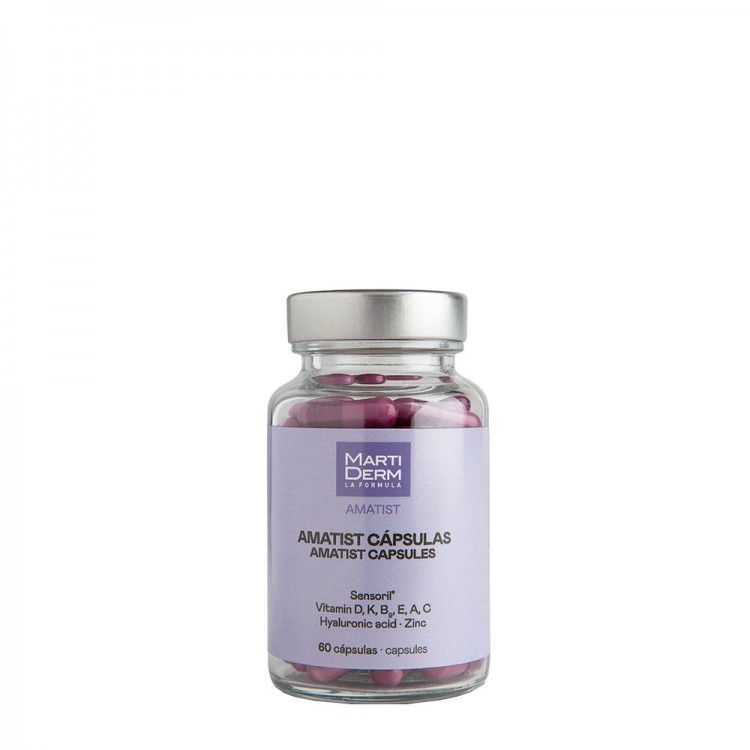Martiderm Amatist 60 Cápsulas: Suplemento alimentar para reforçar e melhorar o estado geral da pele, graças à presença de ácido hialurónico e antioxidantes, a saúde osteoarticular através da vitamina K2, vitamina D3 e zinco e com extrato de Ashwagandha, a