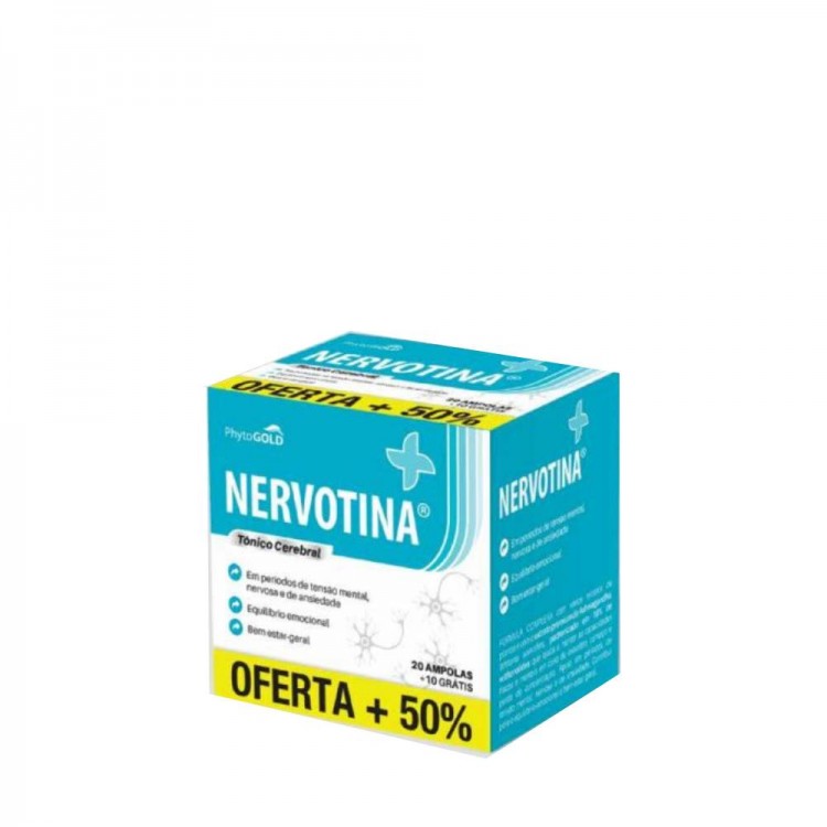 Nervotina Tónico Cerebral contribui para o equilíbrio emocional do dia-a-dia. Este suplemento contém o extrato premium, cientificamente comprovado, de Ashwagandha; bem como GABA, 5-HTP, Melissa, Passiflora e um extrato seco de excelente qualidade proveniente das sementes de Avena sativa. A Aveia é indicada em quadros de exaustão nervosa. Além disso pelo seu valor alimentar nutritivo, vai ajudar a combater o mau colesterol e problemas digestivos, sendo estes alguns do efeitos nocivos da exaustão.