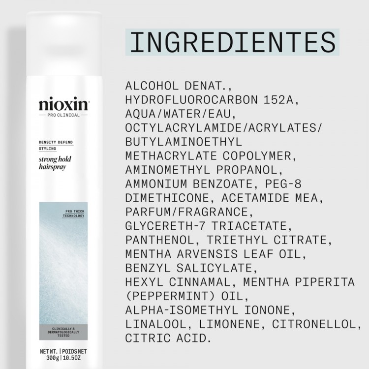 IngredientesAlcohol Denat., Hydrofluorocarbon 152a, Aqua/water/eau, Octylacrylamide/acrylates/butylaminoethyl Methacrylate Copolymer, Aminomethyl Propanol, Ammonium Benzoate, Peg-8 Dimethicone, Acetamide Mea, Parfum/fragrance, Glycereth-7 Triacetate, Panthenol, Triethyl Citrate, Mentha Arvensis Leaf Oil, Benzyl Salicylate, Hexyl Cinnamal, Mentha Piperita (Peppermint) Oil, Alpha-isomethyl Ionone, Linalool, Limonene, Citronellol, Citric Acid.