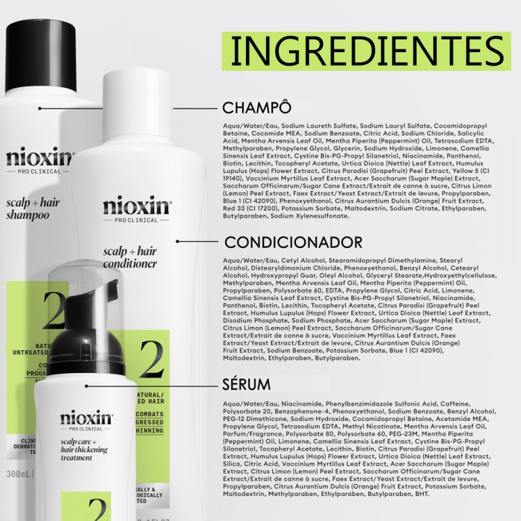 Tratamento: Aqua/Water/Eau, Niacinamide, Phenylbenzimidazole Sulfonic Acid, Caffeine, Polysorbate 20, Benzophenone-4, Phenoxyethanol, Sodium Benzoate, Benzyl Alcohol, PEG-12 Dimethicone, Sodium Hydroxide, Cocamidopropyl Betaine, Acetamide MEA, Propylene Glycol, Tetrasodium EDTA, Methyl Nicotinate, Mentha Arvensis Leaf Oil, Parfum/Fragrance, Polysorbate 80, Polysorbate 60, PEG-23M, Mentha Piperita (Peppermint) Oil, Limonene, Camellia Sinensis Leaf Extract, Cystine Bis-PG-Propyl Silanetriol, Tocopheryl Acetate, Lecithin, Biotin, Citrus Paradisi (Grapefruit) Peel Extract, Humulus Lupulus (Hops) Flower Extract, Urtica Dioica (Nettle) Leaf Extract, Silica, Citric Acid, Vaccinium Myrtillus Leaf Extract, Acer Saccharum (Sugar Maple) Extract, Citrus Limon (Lemon) Peel Extract, Saccharum Officinarum/Sugar Cane Extract/Extrait de canne à sucre, Faex Extract/Yeast Extract/Extrait de levure, Propylparaben, Citrus Aurantium Dulcis (Orange) Fruit Extract, Potassium Sorbate, Maltodextrin, Methylparaben, Ethylparaben, Butylparaben, BHT.