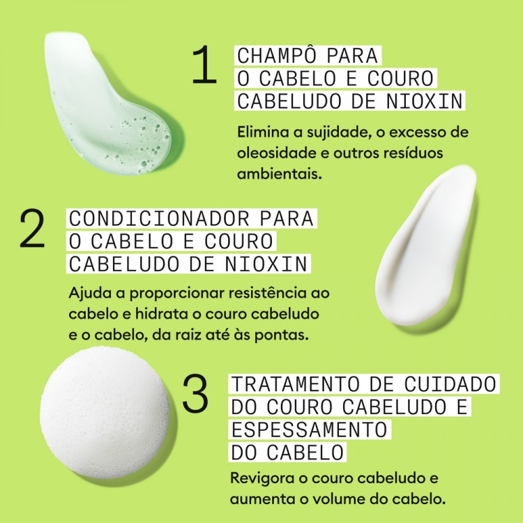 O shampoo ajuda a eliminar a sujidade, o excesso de oleosidade e outros resíduos ambientais do couro cabeludo e do cabelo. O condicionador é um condicionador revitalizante de textura leve que ajuda a conferir resistência ao cabelo e hidrata o couro cabeludo e o cabelo da raiz às pontas. O tratamento revigora o couro cabeludo e aumenta o volume de cada fio de cabelo.