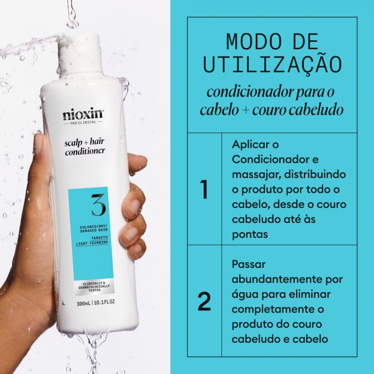 Como aplicarAplicar o condicionador no couro cabeludo e massajar, distribuindo o produto por todo o cabelo, desde o raiz até às pontas. Passar abundantemente por água para remover todo o produto do couro cabeludo e cabelo.