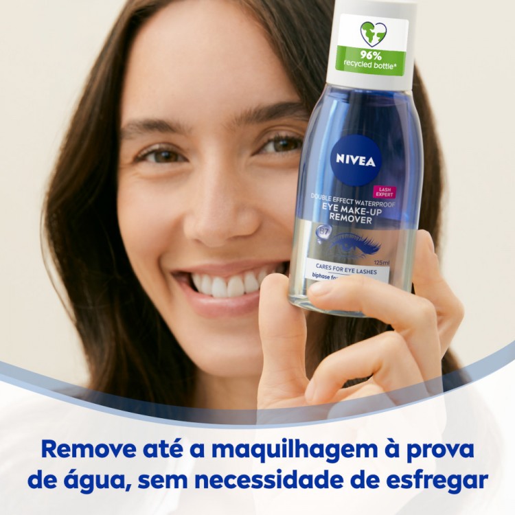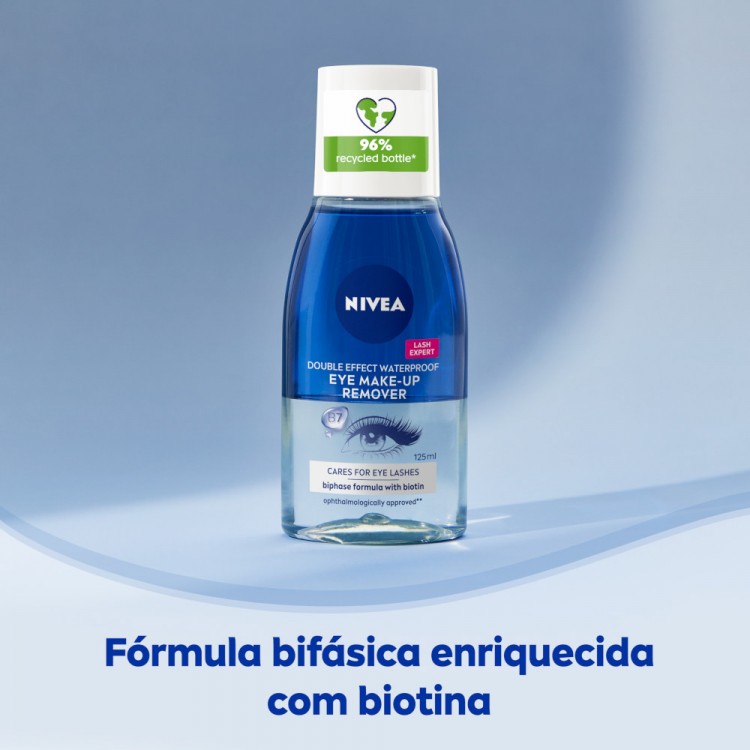 O Desmaquilhante de Olhos Dupla Acção NIVEA, enriquecido com água purificada e centáurea azul, foi desenvolvido para a zona delicada do contorno dos olhos. Remove eficazmente a maquilhagem, mesmo as máscaras de pestanas waterproof e os batons de longa duração sem necessidade de esforço. Protege as pestanas graças à sua fórmula suave bifásica, adequado para todos os tipos de pele: Desmaquilhante de Olhos Dupla Acção, 125 ml. A sua fórmula é vegan, sem ingredientes derivados de animais. As embalagens são feitas de 96% de material reciclado com exceção do rótulo e da tampa.