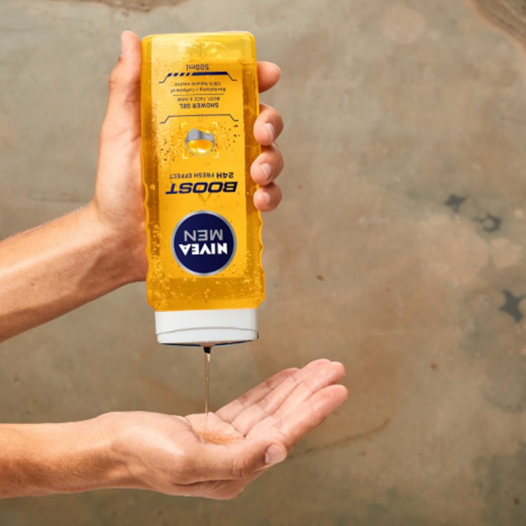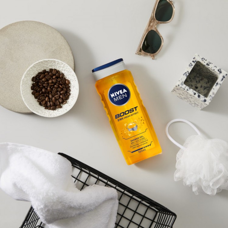 Nivea Men Boost Gel de Duche 500ml: O Nivea Men Gel de Duche Boost, com uma fórmula refrescante com cafeína de origem natural, é a companhia ideal para a tua rotina de despertar matinal. Deixa a tua pele e cabelo revitalizados e cuidados. Em equilíbrio co