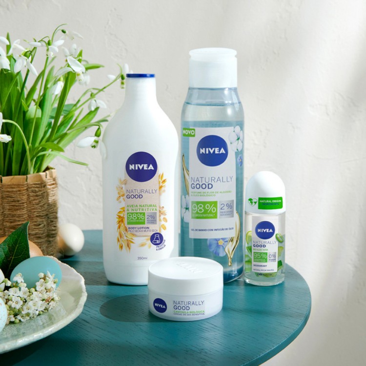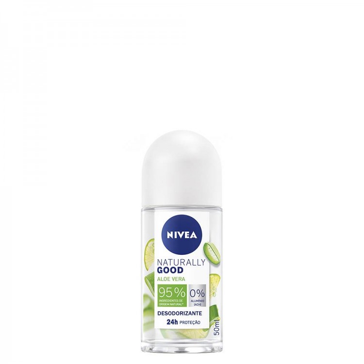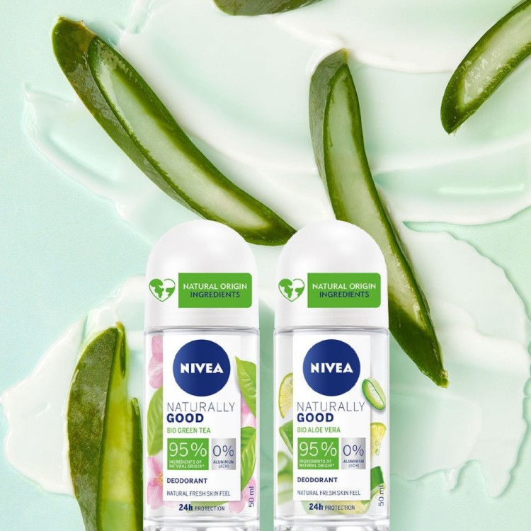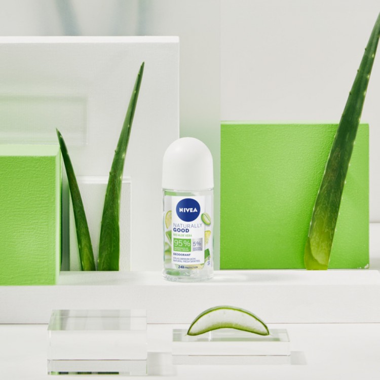 O roll-on Naturally Good comunica com 100% transparência os ingredientes que compõem este produto. A fórmula com bio aloé vera e 0% alumínio (ACH) é 100% vegan e permite uma sensação de frescura natural na pele.