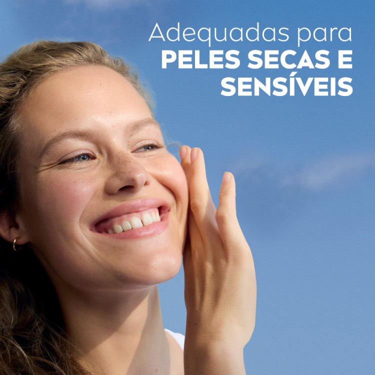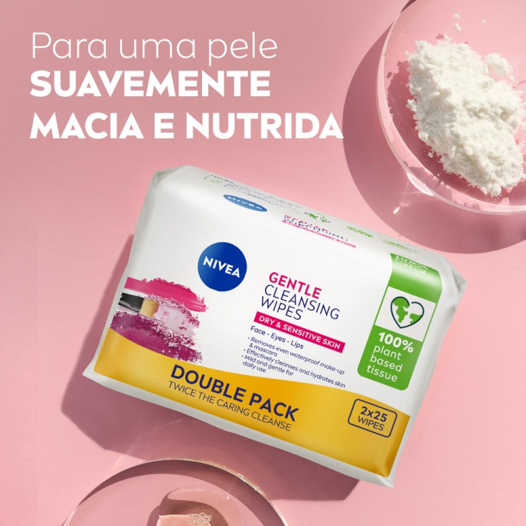 A pele seca a sensível necessita de hidratação máxima todos os dias, pois tende a secar rapidamente. Para manter a pele saudável é importante limpá-la e purificá-la, respeitando, ao mesmo tempo, o seu equilíbrio natural. As Toalhitas de Limpeza Suaves foram especialmente desenvolvidas para satisfazer estas necessidades enquanto limpam a pele. Sem álcool, enriquecidas com Óleo de Amêndoa Natural e uma dose extra de loção NIVEA, removem a maquilhagem e limpam delicadamente olhos, lábios e rosto, deixando a pele suave e macia. O tecido suave derivado de plantas e a fórmula de cuidado feita com ingredientes naturais mimam a pele, num só gesto: NIVEA Toalhitas de Limpeza Suaves 3 em 1 Biodegradáveis.