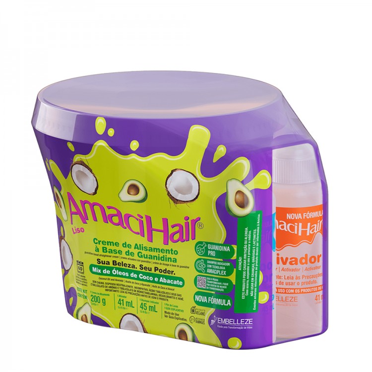 Novex AmaciHair Liso Kit: AmaciHair Liso é um sistema de alisamento que deixa os cabelos profundamente hidratados, macios, nutridos e com um liso perfeito.