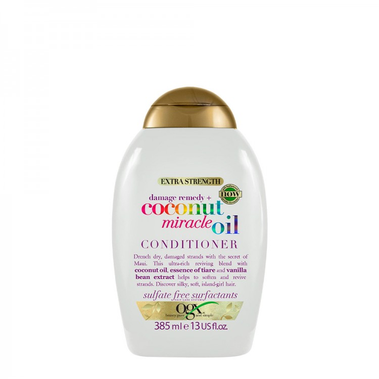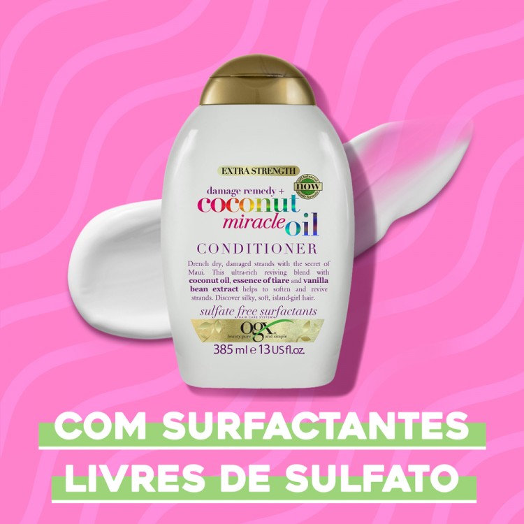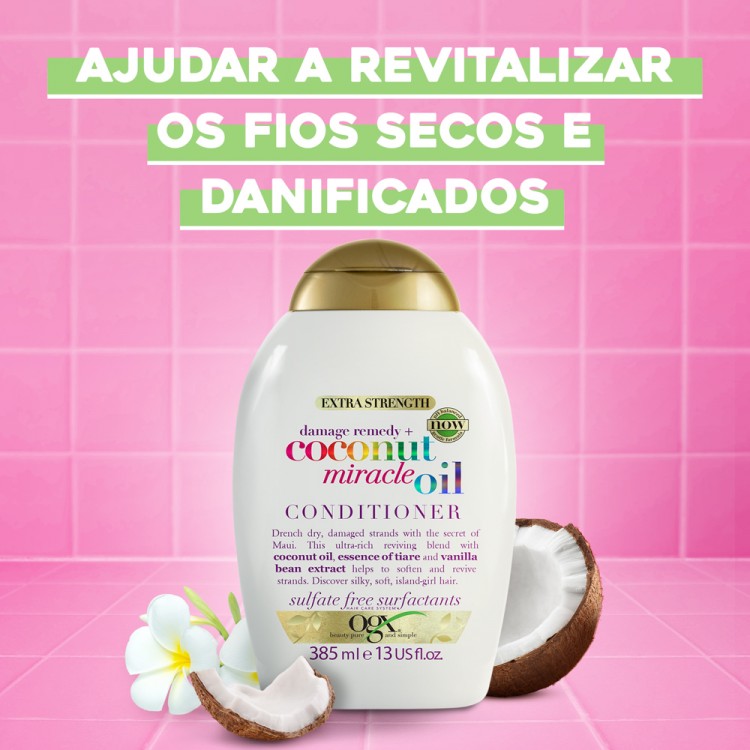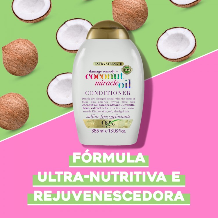 OGX Coconut Miracle Oil Força Extra Condicionador 385ml: Acalma o cabelo frisado e aumenta a elasticidade.