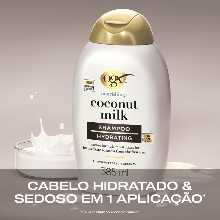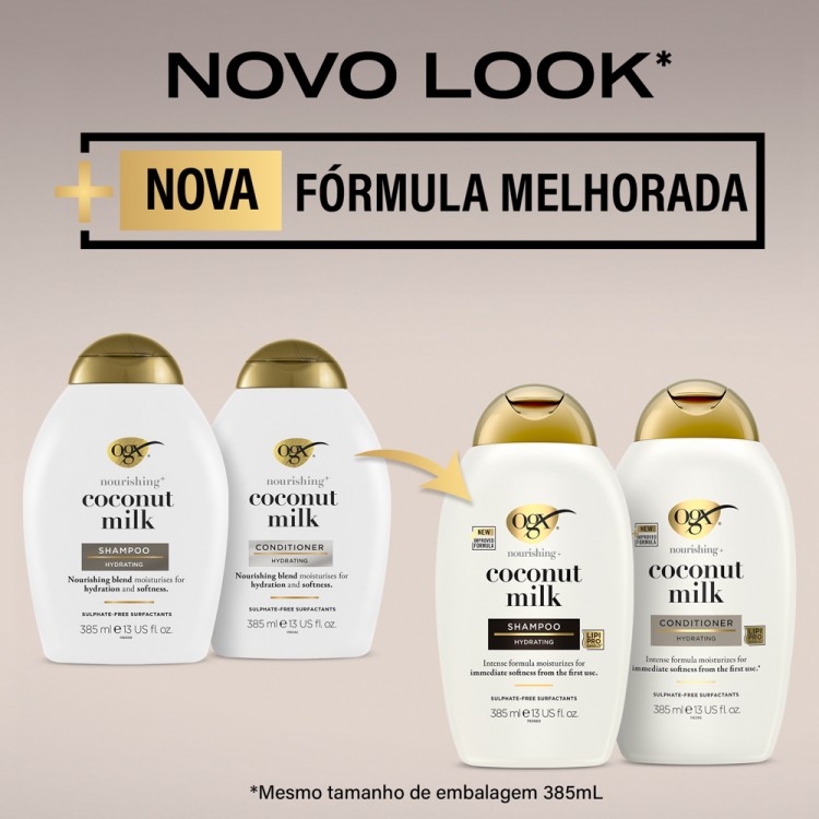 IngredientesAqua/Água/Eau, Sodium Methyl Cocoyl Taurate, Decyl Glucoside, Cocamidopropyl Betaine, Sodium Chloride, Cocos Nucifera (Coconut) Fruit Extract, Hydrolyzed Milk Protein, Sodium Hydrolyzed Potato Starch Dodecenylsuccinate, Coco-Glucoside, Amodimethicone, Guar Hydroxypropyltrimonium Chloride, Hydrogenated Castor Oil, Coconut Acid, Disodium Tetrapropenyl Succinate, Glycol Distearate, PEG-150 Distearate, Hexylene Glycol, Citric Acid, Sodium Hydroxide, Sodium Benzoate, Benzoic Acid, Leuconostoc/Radish Root Ferment Filtrate, Parfum/Fragrance.