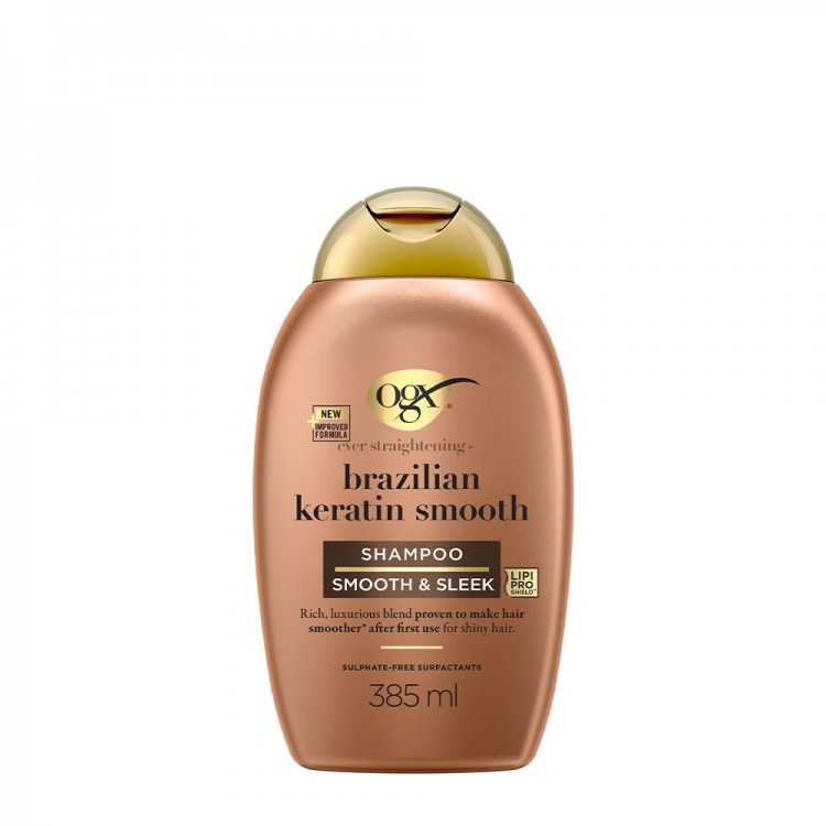 *se usar champô e condicionador, com uso continuado." "O Champô OGX Queratina Brasileira tem uma nova embalagem* feita de plástico reciclado e mais fácil de manusear!