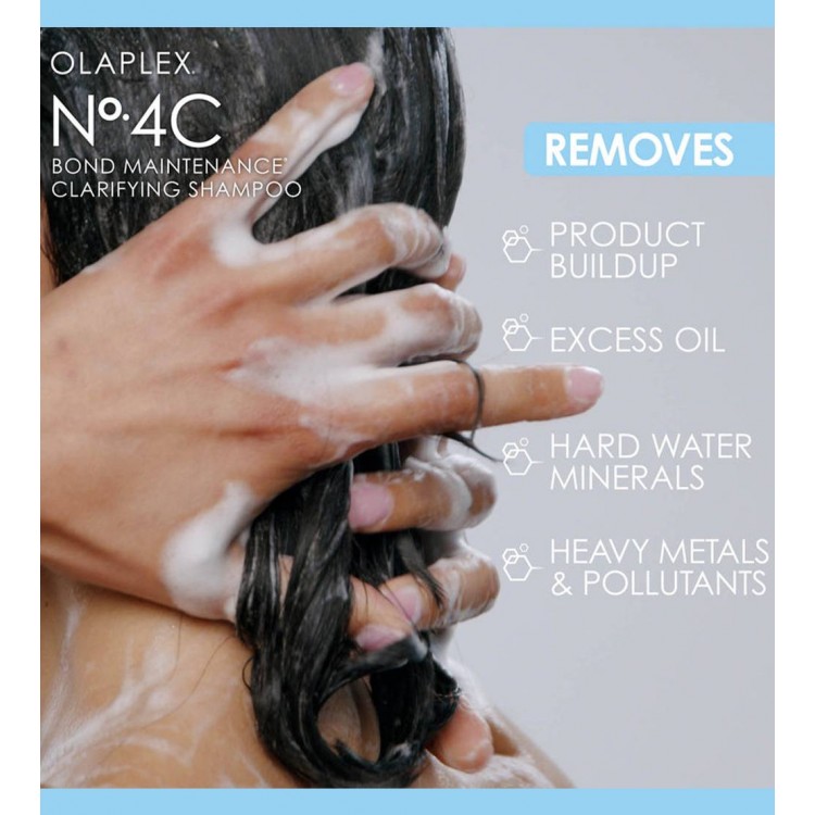 Olaplex Nº4C Bond Maintenance Clarifying Shampoo é formulado com um Sistema de Clarificação de Amplo Espectro para remover acúmulo de produto, excesso de óleo, minerais de água dura, cloro, até mesmo metais pesados ??e poluentes tudo sem causar ressecam