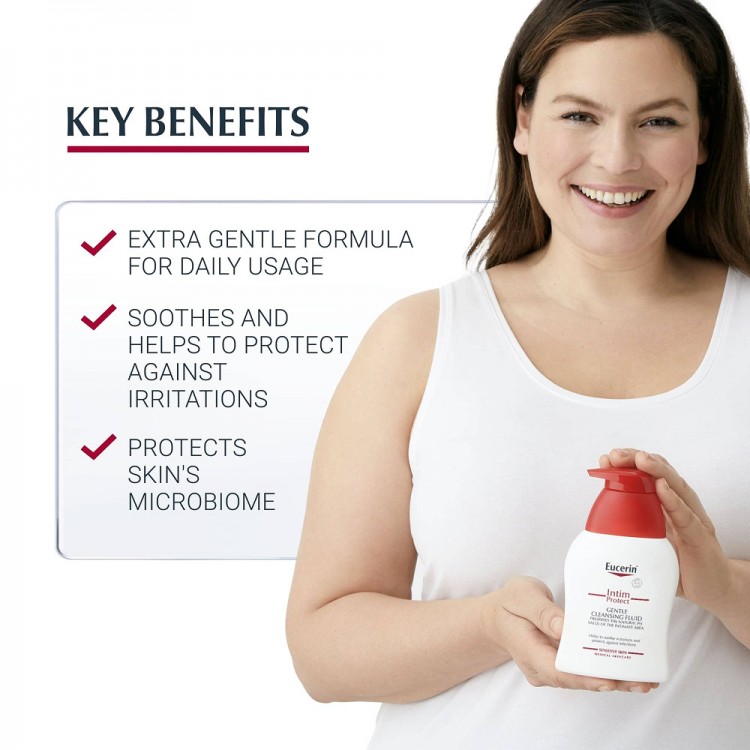 Eucerin pH5 Higiene Íntima Sensitive Skin 250ml: Gel de limpeza suave. Desenvolvido especialmente para a zona íntima, proporciona conforto, proteção e ajuda a acalmar irritações. Sem sabão alcalino, fragrância ligeira.