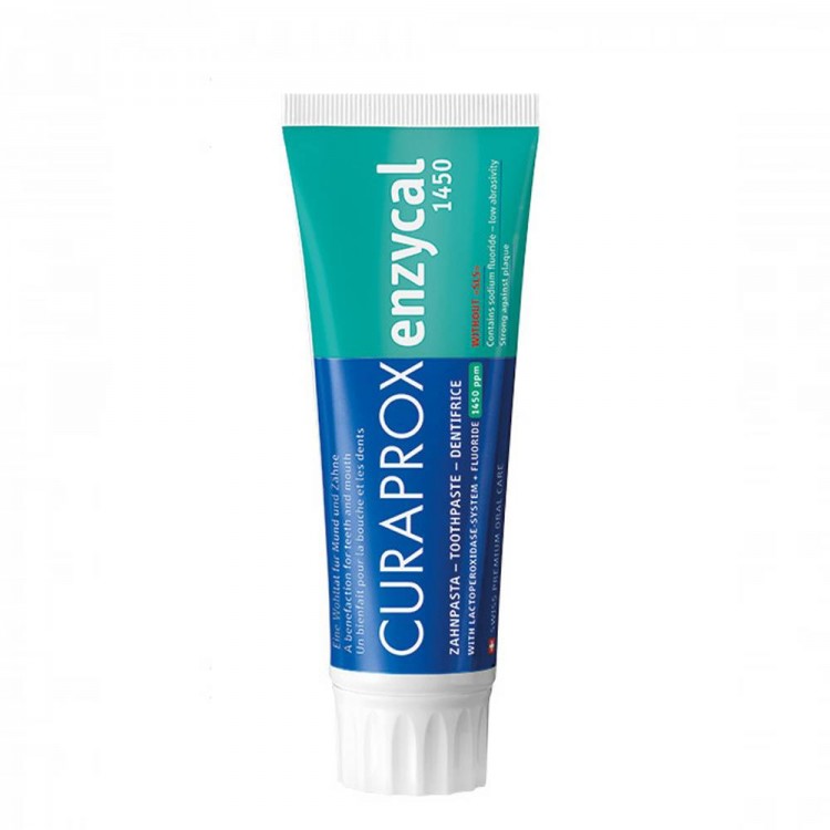 Curaprox Enzycal 1450 Pasta de Dentes 75ml: Pasta de dentes extra refrescante. Dupla proteção contra cáries, graças ao fluoreto de sódio e ao sistema lactoperoxidase, um sistema que potencia o efeito naturalmente protetor da saliva.