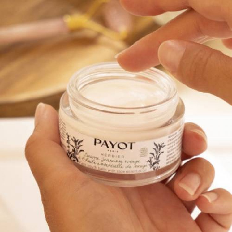 Bálsamo leve, uma mistura de óleos e manteiga, com uma textura fundente e notas naturalmente aromáticas a âmbar do óleo essencial de salva.
