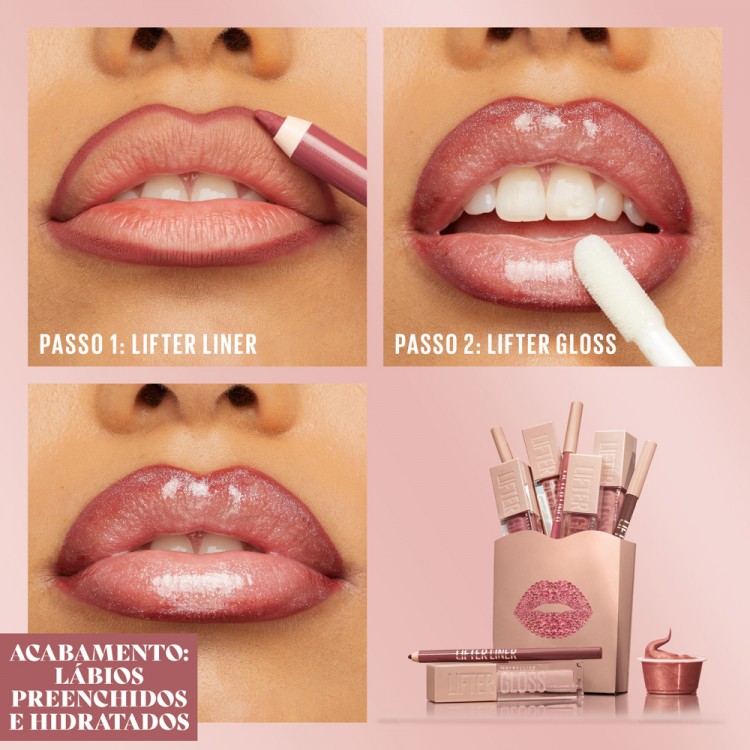 Como aplicar Delinear os lábios com Lifter Liner. De seguida, preencher com Lifter Gloss, para um acabamento brilhante e duradouro.