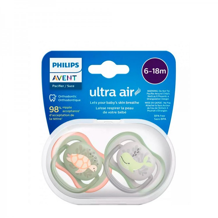 Philips Avent Ultra Air Chupeta Baleia e Tartaruga 6-18m Duo: Deixa a pele do teu pequeno respirar com a chupeta Philips Avent Ultra Air.