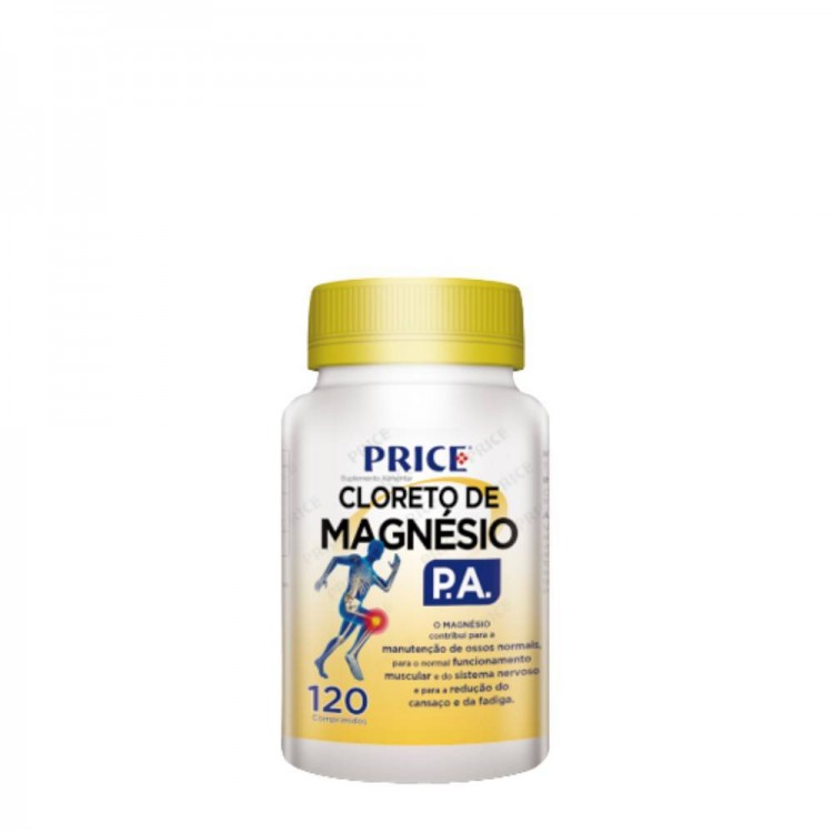 Price Cloreto de Magnésio P.A. 120 Comprimidos: O Cloreto de magnésio P.A., ou "Puro para Análise", contribui para a manutenção de ossos normais, normal funcionamento muscular e do sistema nervoso e para a redução do cansaço e da fadiga.