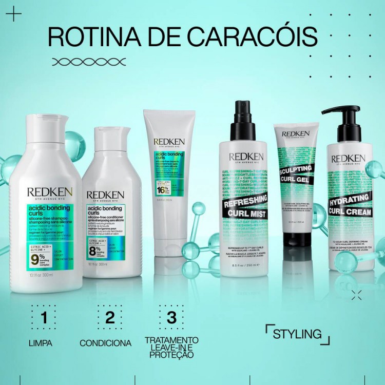 A tecnologia Curl-Bond (Ácido Cítrico, Ureia e Glicina) ajuda a recuperar ligações e reforçar a estrutura interior do cabelo.