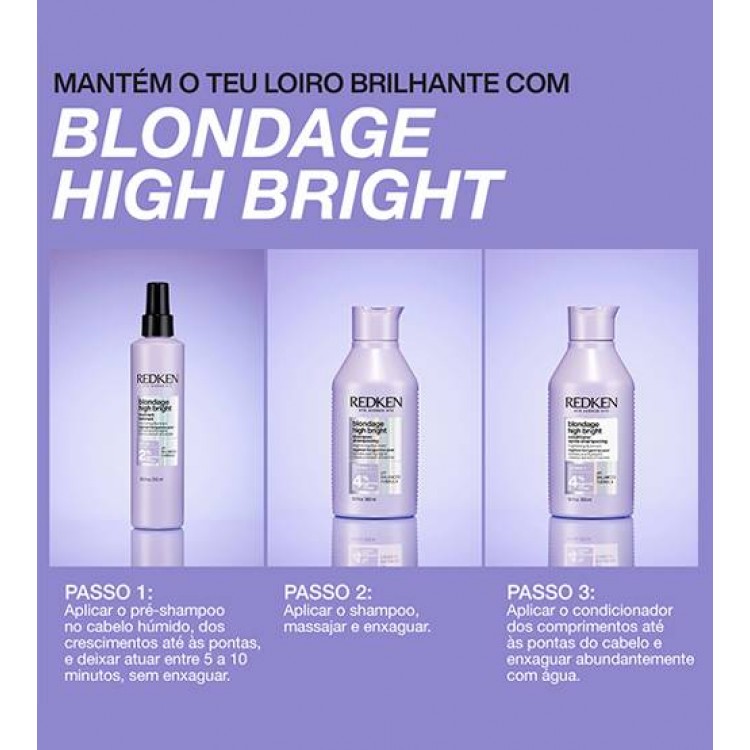 Aplicar o shampoo, deixar atuar e enxaguar. Utilizar a rotina completa Blondage High Bright até atingir o tom desejado e depois alternar com a sua gama Redken preferida. Evitar o contacto com os olhos. Manter fora do alcance das crianças.