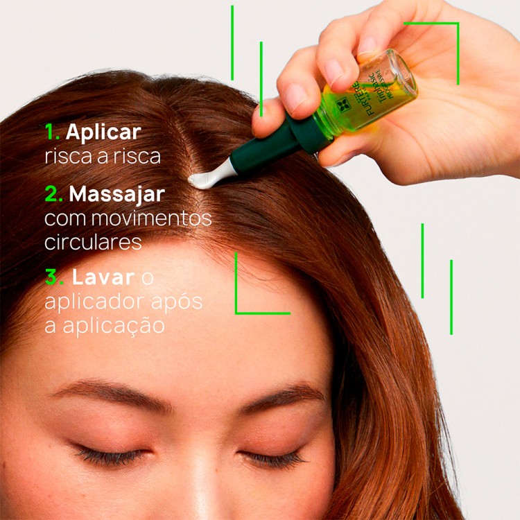 Após a lavagem, aplicar risca a risca no couro cabeludo limpo e húmido. Para deixar o produto absorver, massajar em movimentos circulares usando a ponta do aplicador massajador. Enxaguar o aplicador após a aplicação. Não enxaguar o couro cabeludo.