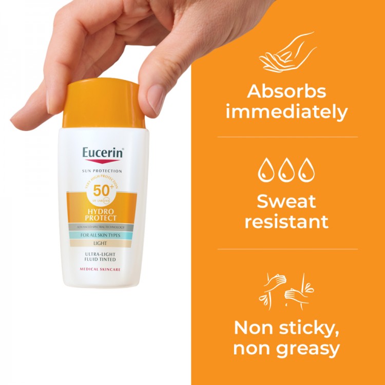 Eucerin Sun Hydro Protect Tom Claro SPF50+ foi desenvolvido com a Tecnologia AOX Shield, tornando-se assim um protetor solar de última geração que vai além da proteção UV tradicional. Protege contra queimaduras solares e danos cutâneos, sendo o fluido ultralight perfeitamente adequado para todos os tipos de pele, incluindo a pele sensível. A sua fórmula é enriquecida com antioxidantes nutritivos e com um "boost" de hidratação para uma sensação de frescura prolongada na pele. Tem uma textura ultraligeira de absorção imediata (0% resíduos).