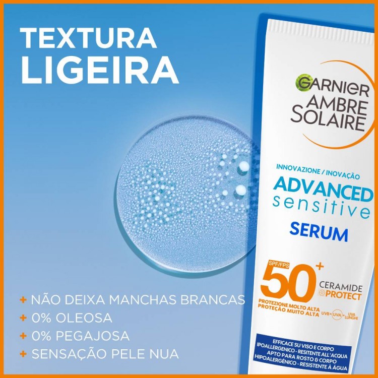 Garnier Ambre Solaire Sérum Advanced Sensitive SPF50+ 125ml: Ambre Solaire Sensitive Advanced Sérum de corpo SPF 50+ é um protetor para peles sensíveis, reativas ou alérgicas ao sol. Oferece proteção imediata contra os raios UVB, UVA inclusive os longos,