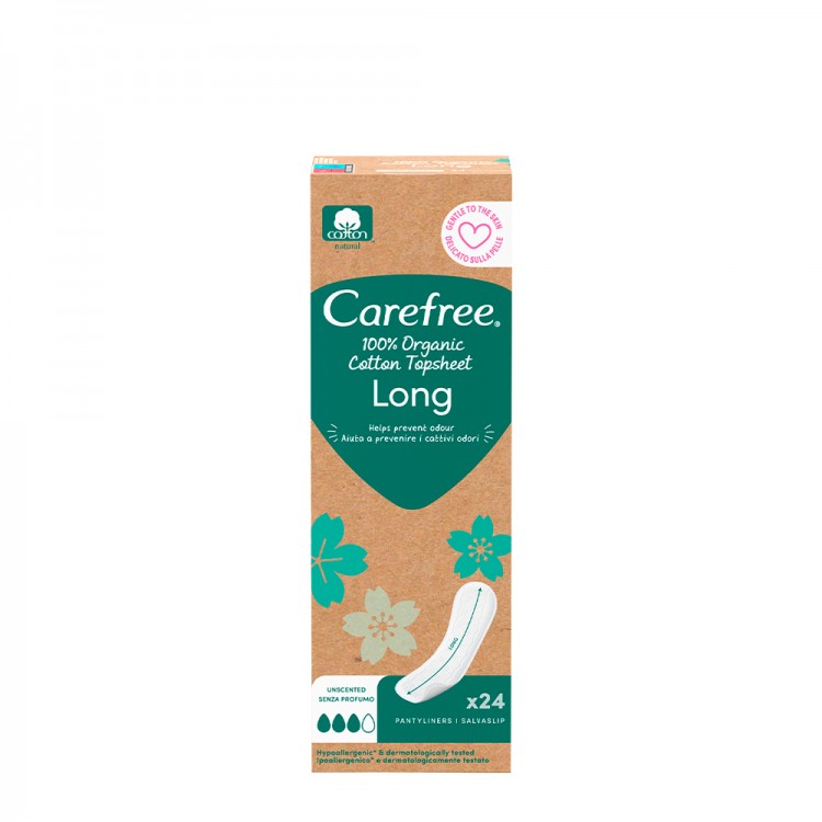 Os pensos diários Carefree Long foram concebidos para proporcionarem proteção duradoura e controlo do odor até 12 horas. São mais largos e mais longos do que os pensos diários da gama Cotton, para uma proteção extra. Com uma nova película suave ao toque que absorve líquido rapidamente e um núcleo superabsorvente que ajuda a reter a humidade de imediato. Sentes-te fresca e confiante ao longo do dia.