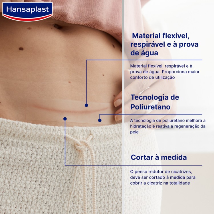 Os pensos redutores de cicatrizes da Hansaplast são pensos transparentes, autoadesivos, feitos de poliuretano. Os produtos fabricados com este material são utilizados há anos no tratamento profissional de feridas. Os pensos não contêm ingredientes ativos (produtos farmacêuticos) que possam causar efeitos secundários. São uma forma segura e eficaz de reduzir eficazmente as cicatrizes hipertróficas elevadas e coloridas ou as cicatrizes quelóides.
