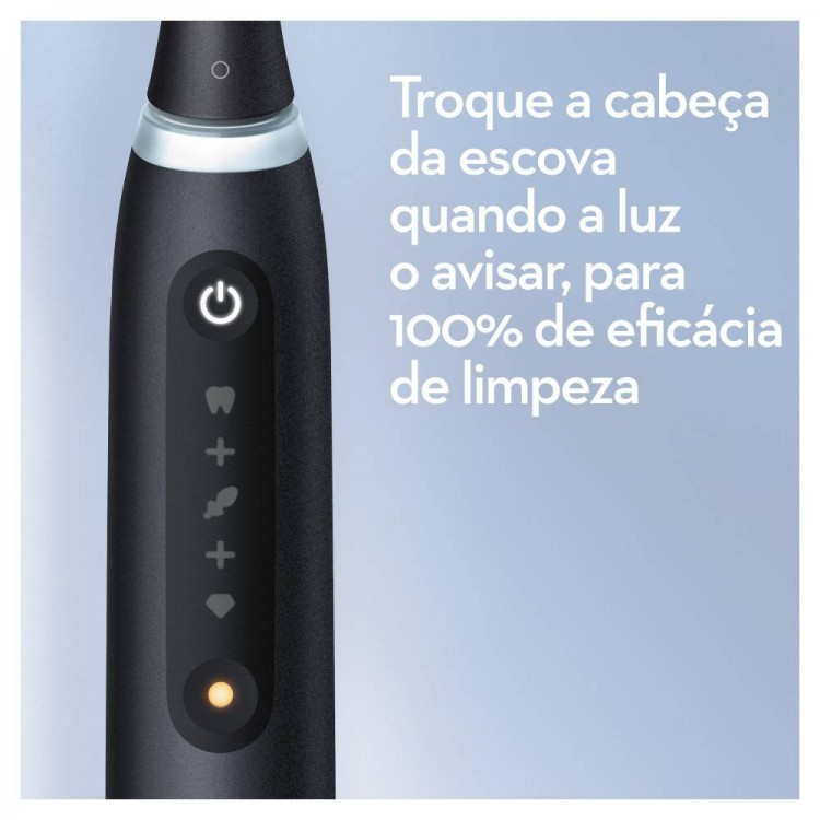 A escova de dentes elétrica iO 5 inclui a melhor tecnologia da Oral-B, combinando uma cabeça de escova redonda inspirada pelos dentistas com cerdas microvibrantes para uma sensação de limpeza purificante, profissional, em casa. O sensor de pressão inteligente ajuda a evitar que escove com demasiada força ou demasiada suavidade, para proteger melhor as gengivas. O reconhecimento do tipo de escovagem com inteligência artificial reconhece a sua escovagem e orienta-o para uma melhor escovagem todos os dias. Liga-se à App Oral-B, gratuita, para seguimento e orientação da escova em tempo real em seis zonas de escovagem. Substitua a cabeça da escova de dentes Oral-B iO de três em três meses para obter os melhores resultados.