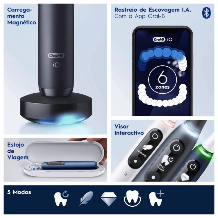 BenefíciosA melhor limpeza de sempre da Oral-B com tecnologia iO revolucionária magnética para uma sensação de limpeza profissional e uma experiência de escovagem suave.