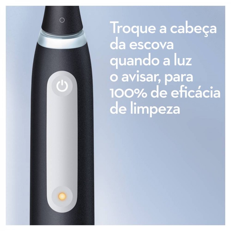 A escova de dentes elétrica iO 4 inclui a melhor tecnologia da Oral-B, combinando uma cabeça de escova redonda inspirada pelos dentistas com cerdas microvibrantes para uma sensação de limpeza purificante profissional em casa. O Sensor de Pressão Inteligente ajuda a evitar que escove com demasiada força ou demasiada suavidade para proteger melhor as gengivas. A proteção das gengivas alerta-o para o tempo despendido a escovar com demasiada pressão. Substitua a cabeça da escova de dentes Oral-B iO de três em três meses para obter os melhores resultados.