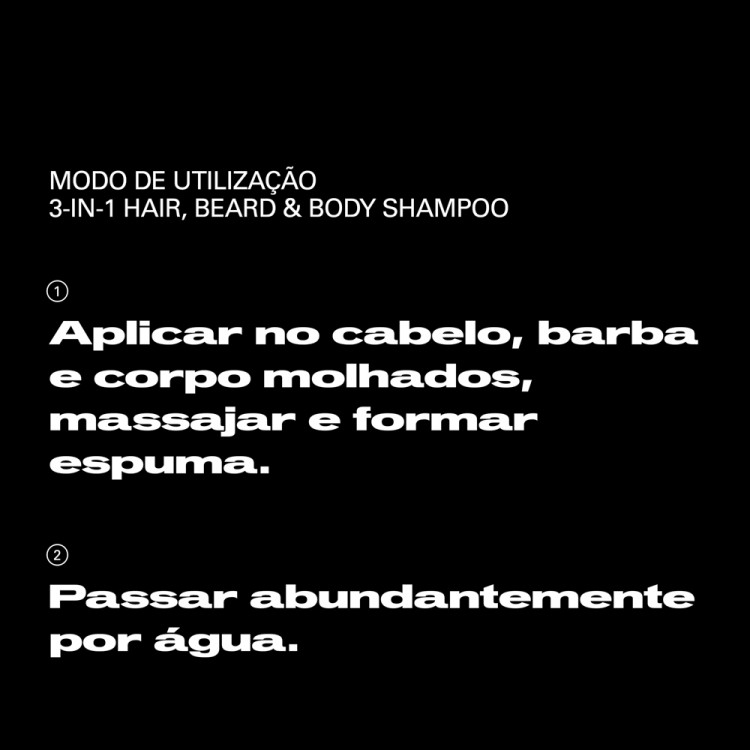Como aplicarAplicar uma pequena quantidade do shampoo Multitasker. Massajar para criar espuma no cabelo, barba e corpo húmidos. Enxaguar bem.