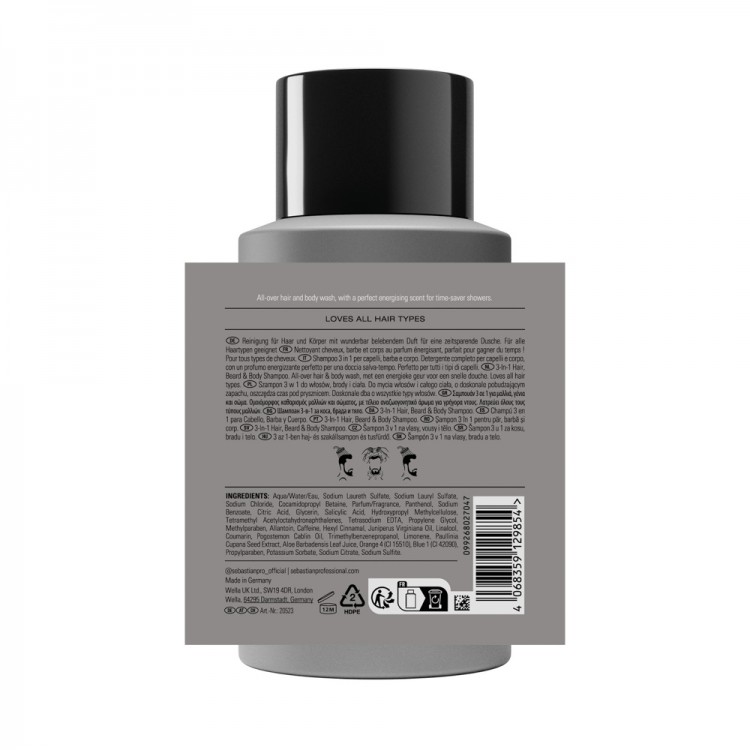 DescriçãoEste shampoo-gel 3 em 1 para cabelo, barba e corpo oferece uma ação prática e um aroma estimulante, ideal para poupar tempo no duche. Formulado com fragrância de bergamota e pimenta rosa, limpa em profundidade e deixa uma sensação fresca e revigorante. Adequado para todos os tipos de cabelo, barba e pele.