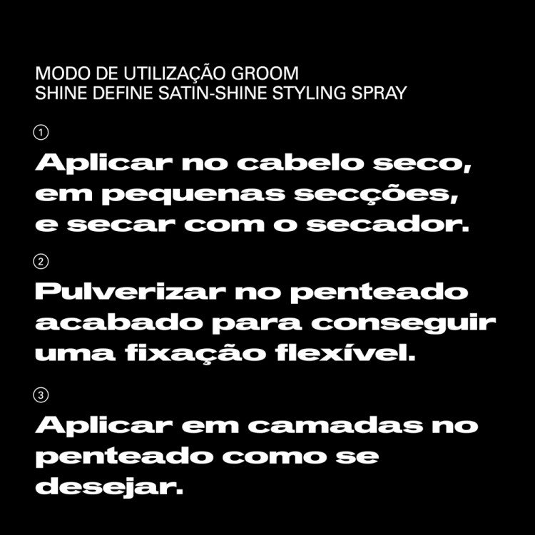 Como aplicarAplicar no cabelo seco. Pulverizar em secções antes de utilizar calor. Pulverizar no penteado para uma fixação flexível. Aplicar em camadas para conseguir mais fixação.