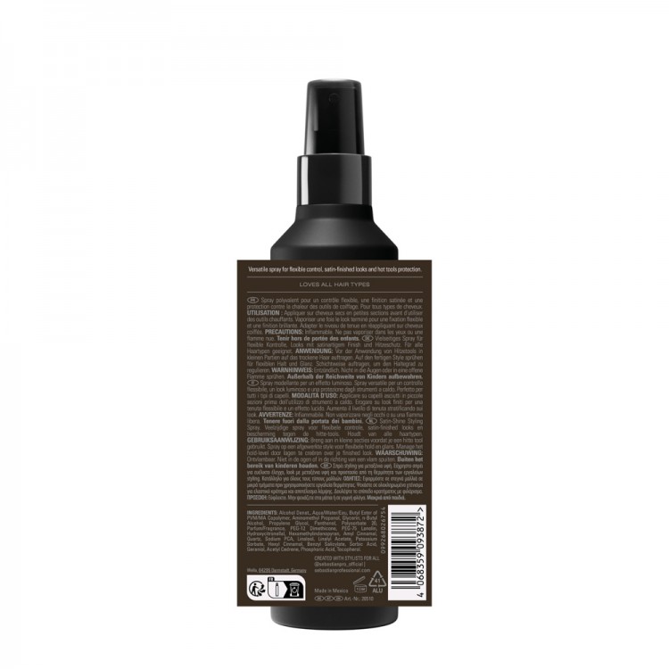 DescriçãoEste spray versátil proporciona controlo flexível, acabamento de brilho acetinado e proteção contra o calor de ferramentas até 230°C / 450°F. A sua fórmula permite criar estilos com forma e movimento, protegendo o cabelo e deixando-o suave e com brilho natural. Adequado para todos os tipos de cabelo.