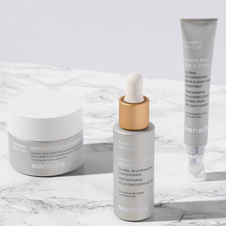 Contorno de olhos com ação anti-papos, anti-olheiras e anti-envelhecimento localizada. Crio-aplicador descongestionante. Origin Pro - Efeito rejuvenescedor global com 2 benefícios principais: ação ultra-refirmante e ultra-regeneradora. Fórmula patenteada com a combinação de 5 fatores de crescimento e Células Mãe.