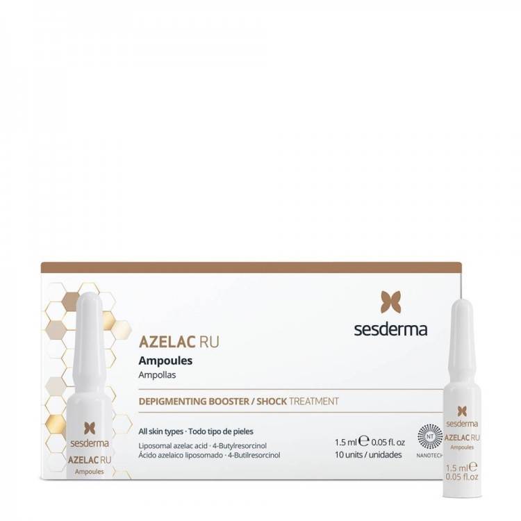 Ampolas para tratamento de choque intensivo para melasma, hiperpigmentações pós-inflamatórias e outros tipos de hiperpigmentações. Todo o tipo de pele. Adequado a fotótipos elevados. Sem parabenos. Não recomendado durante a gravidez.