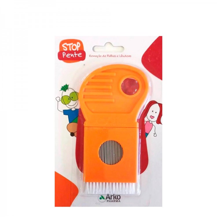 Stop Pente com Lupa facilita a remoção de piolhos e lêndeas. Tem uma lupa com aplicação de 200x, uma pega antiaderente e encaixe protetor com escova para limpar o pente.