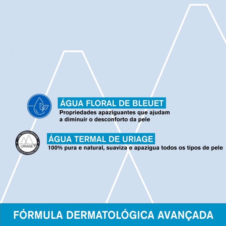 Apazigua: Graças à presença de Água Floral de Bleuet e Água Termal de Uriage, acalma a pele e oferece uma sensação de conforto.